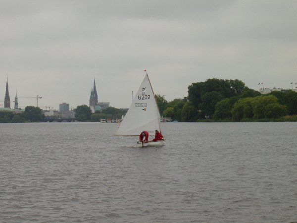 Um die Alsterschale 2004 segelten diesmal zehn Mannschaften um die Wette. Hier Steuermann Ole Wasmuth (NRV) mit seinem Vormann im 12ft-Dinghy GER202 vor dem ersten Start am Samstag.