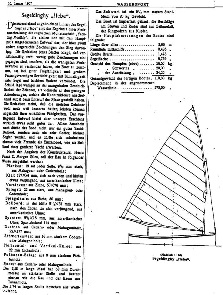 Das Segel ist nach dem Segelriss der Werft anzufertigen. Zusätzlich wird eine Mittelbreite wie folgt vermaßt: Von Mitte Achterliek zum Anschlagpunkt der Rah beträgt das Maß 2,59 m. Ein Fenster im Segel bis zur maximalen Größe von O,4 qm ist an geeigneter Stelle zulässig. Segellatten und Lattentaschen sind nicht erlaubt. Das Segeltuch muss aus gewebtem Material bestehen. Als gewebtes Material sind Stoffe anzusehen, bei denen sich die Fasern ohne Filmrückstände voneinander trennen lassen. Kevlarfasern bzw. Mylarfolie in den Segeln sind nicht gestattet. Das Tuchgewicht beträgt 170 bis 200 g/qm. Kopfbretter oder Kopfhölzer aus Aluminiumblech, Holz, Leder oder anderem Material sind nicht zulässig. Eine Verstärkung des Tuches durch Dopplungen sind jedoch vonnöten. Alle Segelmaße sind Maximalmaße. Der Baum muss ab Hinterkante Mast nach 3,7 m eine 1,0 cm breite Messmarke führen und das Segel muss innerhalb dieser Marke gefahren werden. Das Klassenzeichen besteht aus: 12´- GER ..., Farbe: beliebig Die Mindestgrößen für das Klassenzeichen, den Nationalitätsbuchstaben und die Unterscheidungsnummer beträgt: Höhe 300 mm, Breite 210 mm (ausgenommen die Ziffer "1"), Strichstärke = 45 mm. Der Abstand zwischen den benachbarten Buchstaben und Ziffern muss 60 mm betragen.