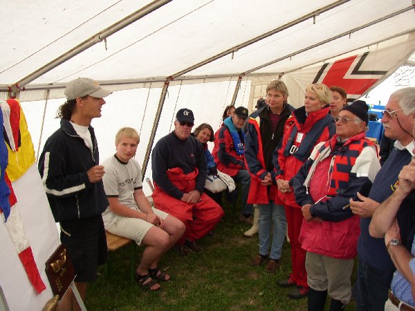 Steuermannsbesprechung am Samstagmorgen. Die Wettfahrtleitung und Wettfahrtorganisation hat Helly Bruhn-Braas wie in den vergangenen Jahren ihrem Sohn Alexander übertragen (www.the-friendship.de). Der Hugo-Bruhn-Gedächtnispokal wird alle zwei Jahre, dieses Jahr zum fünften Mal ausgesegelt. Dreizehn Mannschaften traten gegeneinander an.